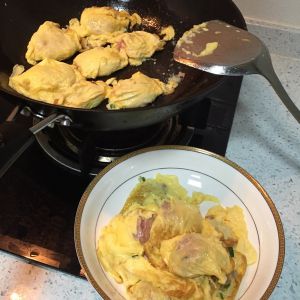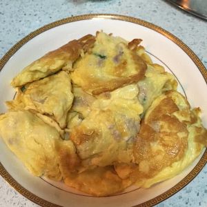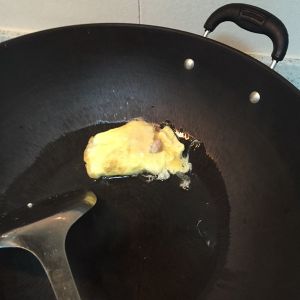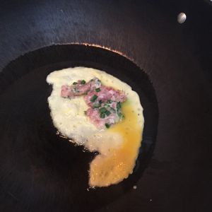锅放油浇上一勺蛋液,鸡蛋成型后在上面放一勺猪肉馅。