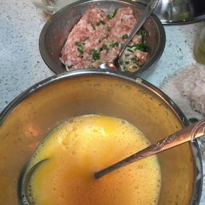 猪肉剁碎放适量盐鸡精胡椒粉生粉葱花拌匀,鸡蛋打散备用。