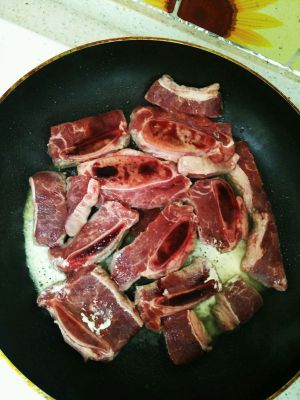 另外平底不粘锅大火烧热放入黄油迅速把腌制好的牛仔骨放入,高温锁住牛仔骨水分。再换中火煎。