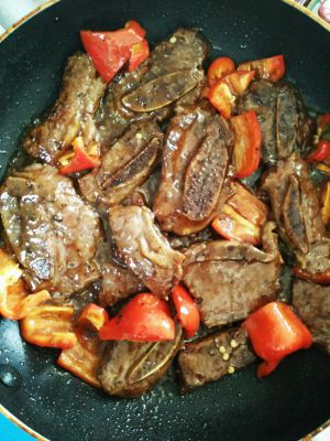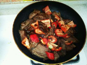最后出锅磨点黑胡椒粒。步骤写的罗嗦其实也就是两分钟的过程啊。别忘了边上还有加热的铁盘呢。牛仔骨一老就咬不动了。