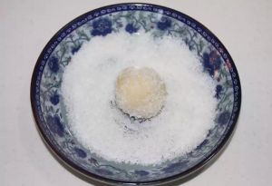 7.包好搓圆后放椰蓉里滚一滚表面粘些椰蓉即可