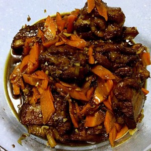 炒锅加少许油,放入葱末煸出香味,倒入胡萝卜片翻炒后加入去骨的排骨肉,翻炒均匀。
