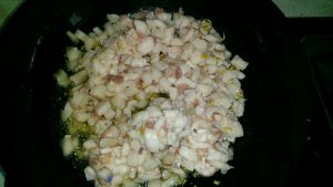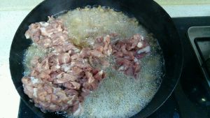姜末爆香后加入肥肉丁,大火翻炒。