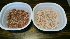 把买来偏肥的猪腿肉切成比花生米稍小大小的肉丁,肥瘦分开,这一步是整个制作过程最费力耗时的。