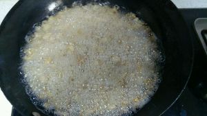 将肥肉丁内的油脂炸出后,肥肉丁稍泛黄色,油水起大泡。