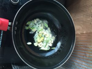 把虾尾倒入锅中!炒,一直翻炒两分钟!