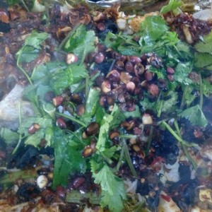 230℃烤25分钟,出锅放炒熟的花生米,放香菜。