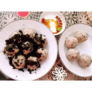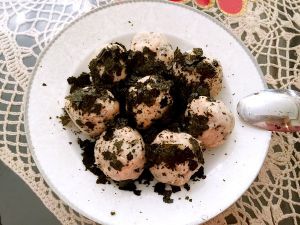 戴上一次性手套,将半成品捏成大小均匀的大力丸,入盘后再撒上一层海苔装饰。
