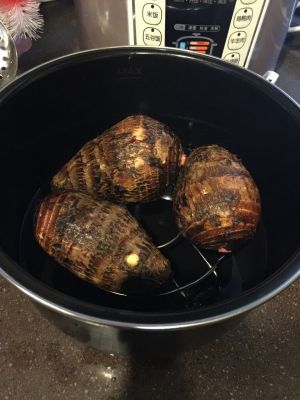 这边没写每个食材的重量,大家可以根据自身喜好来。第一步就是先把芋艿蒸熟,压成泥。三文鱼也稍微热一下,全部变色即可,生的不容易弄碎。