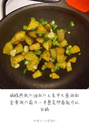 锅烧热放油加入土豆中火煎 加入盐黑胡椒 两面金黄后放入蒜片一半葱花炒香出锅