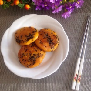 包成圆形,撒上少许芝麻入锅小火煎,记得翻面,以免煎焦了