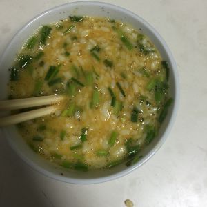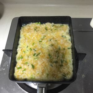 锅中倒油烧热倒入少量米饭鸡蛋混合液。