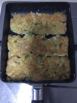在锅中用工具分成自己喜欢的小块。然后每个翻面再煎黄。