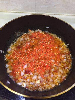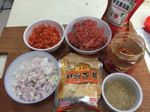 准备好所有食材,牛肉我喜欢切末,洋葱、辣椒切碎。我这个辣椒炒级辣,所以用了配料表里的量。