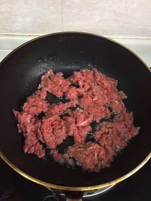 牛肉末用适量油炒至变色,淋入料酒煮五分钟,盛出待用。