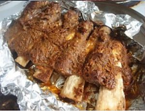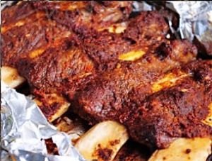 把锡纸打开,倒出汤汁,排骨翻面,顶面不要再覆盖锡纸,