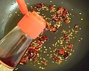 锅下油小火炒香剪成圈的干辣椒,起锅时淋入1茶匙芝麻油激香。
