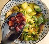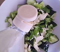 倒出黄瓜腌出的水份,放入切好的香菜和蒜末,淋入1汤匙米醋。再淋入2汤茶匙生抽、2汤匙辣椒油拌匀。