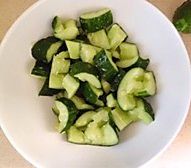 黄瓜洗净晾干表面的水分放砧板上,用菜刀平拍使黄刀开裂。横着切几刀,使黄瓜切成方块。黄瓜放入碗中,撒入1茶匙盐拌匀,腌5分钟。