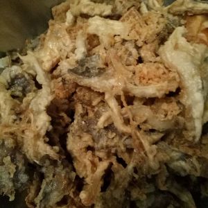 放进和好的面糊中。待油热,放入锅中。炸至酥焦,金黄。就可以出锅了。