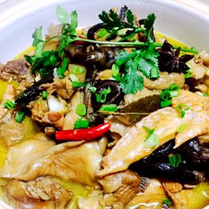 选优质东北野生榛蘑和冻蘑,用水反复清洗,清水泡发半小时左右…在东北,榛蘑炖小鸡最配,但是冻蘑口感也不错哟…