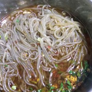 用漏勺将粉捞出放入大碗里,加入之前准备好的各种调料