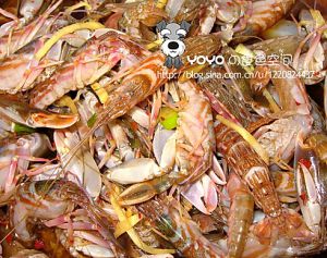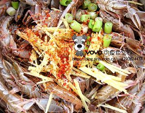 活嘎巴虾,冲洗干净,加大量姜、糖、辣椒、葱、生抽、盐(也可加些八瓣花椒水)