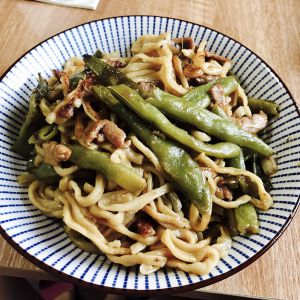 4.汤汁收干后把蒜放进去,把扁豆和面进行搅拌
