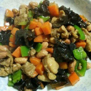 木耳泡好切碎,青椒和胡萝卜切丁。(这道菜比较油腻,所以我特意放了木耳吸油。)