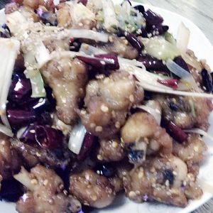 锅留少量油放入辣椒段、花椒、葱姜蒜炒香 倒入炸好的鸡块翻炒均匀 放入少量鸡精、香菜出锅装盘