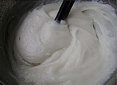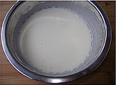 在盆里倒入牛奶、糖粉、色拉油搅拌均匀