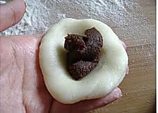 把冷却的冰皮分成50克一个,豆沙馅分成30克一个(我用的是六个头的模子)。在手上拍点糕粉防粘,然后象包月饼一样用冰皮把豆沙包起来,并慢慢往上推,直到把豆沙全部包裹住,收口