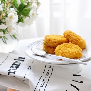 再压扁成饼状,依次沾上面粉、蛋液、面包糠