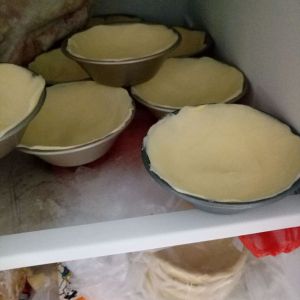 然后把面皮从一边卷起来,用刀切成1厘米左右,按扁,放入蛋挞模型中整形。