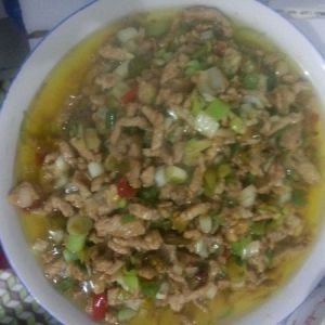 肉切丝,水淀粉抓一抓,大葱,泡椒切碎,糖醋调好