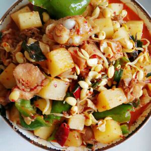倒入切好的土豆和豆芽翻炒后,盖上锅盖闷熟