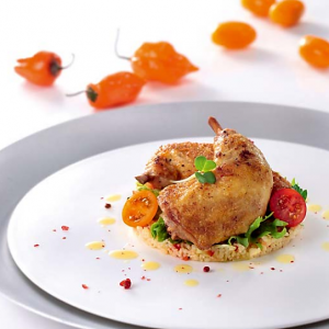 将小米色拉放入碟中,放上鸡腿及鸡胸,以圣女果装饰即可。