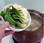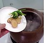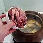砂煲烧开水后,放入猪手与猪肚,下入葱姜,倒入料酒,大火烧开后,改小火炖2个半小时左右;