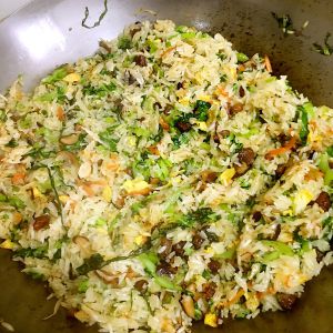 锅中倒入油烧热,再依次将配料和调料入锅进行翻炒,萝卜丝和芥菜丝最后放,然后差不多了再将蒸熟的糯米饭倒入锅中翻炒。过程很简单,就跟平时的炒饭是一样的~