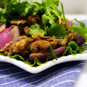 出炉后,取一个盘子里底下放两叶生菜,再放上羊肉,表面再放上一些香菜,这样一盘可口的烤羊肉就出来了,味道 极赞