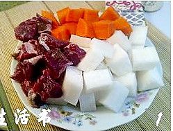 牛肉洗净切块,胡萝卜、白萝卜洗净切块;