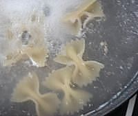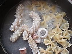 将鲜虾、鱿鱼卷、鲜带子一并放入意面中煮熟捞出;
