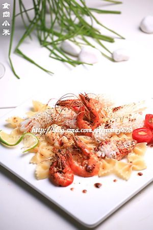 将意大利蝴蝶面、鲜虾、鲜带子、鱿鱼卷、嫩豆苗尖摆放在盘中用挤奶油的带子均匀的挤上沙拉酱汁即可。