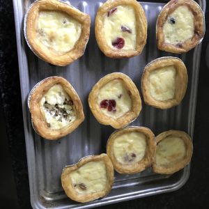 把蛋液导入蛋挞皮里,再放入自己喜欢的葡萄干和蔓越莓干,酸酸甜甜的。