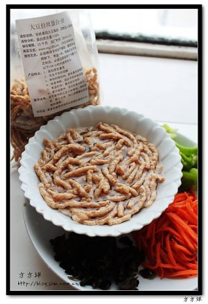 大豆拉丝蛋白,胡萝卜,青椒,木耳。木耳和拉丝蛋白事先用水泡上。胡萝卜和青椒切丝。