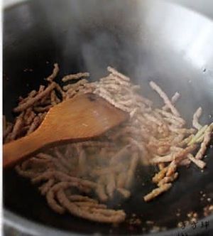 下胡萝卜丝,木耳,青椒丝炒软,同时取一小碗用酱油、精盐、白糖、米醋调成味汁,调好后倒进锅里翻炒,最后勾薄芡后出锅。