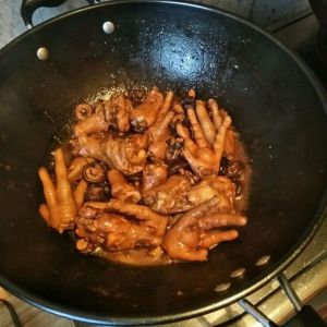 开锅热油,放入白糖,然后放入鸡爪翅根,放入姜片翻炒几下,然后倒入刚刚腌制鸡爪翅根的酱油料酒混合物