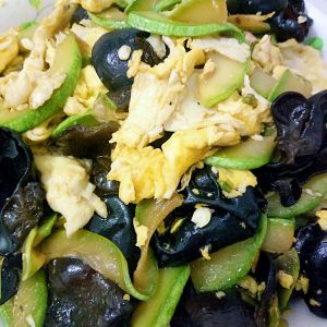 油热后放葱丝姜丝还有一点鸡粉,炒几下放入西葫芦,待西葫芦变色以后放入木耳,翻炒几下加生抽提味,倒入炒好的鸡蛋,加盐后翻炒均匀出锅。