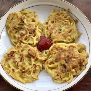 放入不粘锅,定型后加油,这样蛋糊不会到处流。中小火两面煎金黄即可。