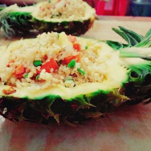 把洋葱、胡萝卜切小块,取出来的菠萝切块放入盐水浸泡。虾仁最好用新鲜的,没有新鲜的用干的也可以,洗一下泡泡。